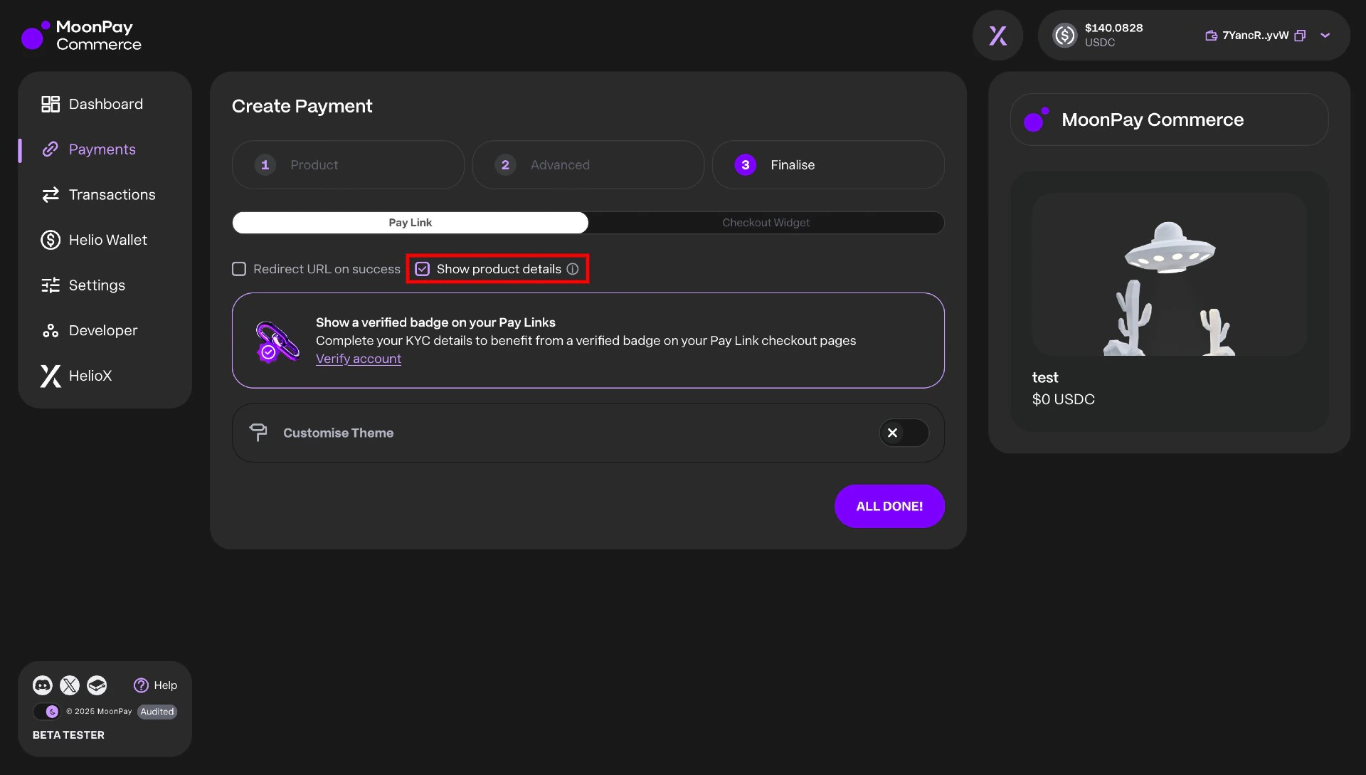 Within MoonPay Commerce, you can display the product name, description, and image from your pay link directly on the charge page, mirroring your original pay link. To do this:- Ensure your