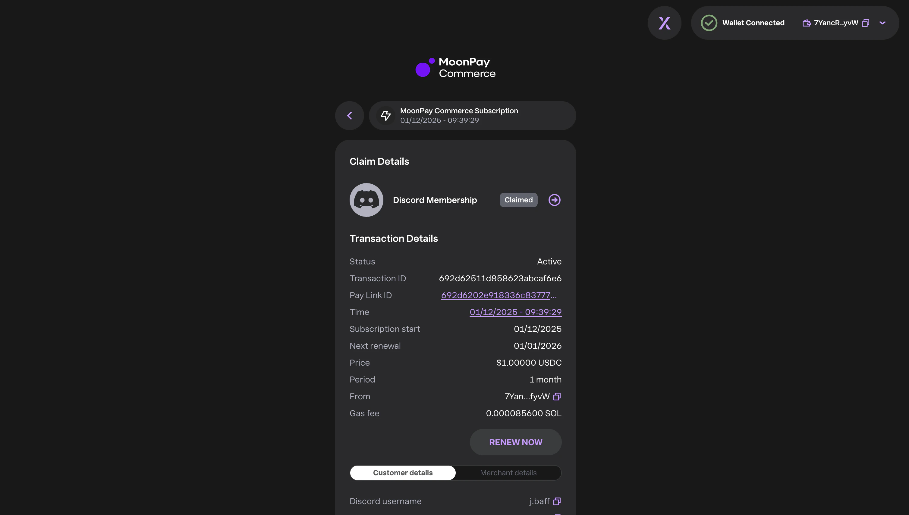 Roles can be assigned in real-time or claimed later. Share the Pay Link anywhere. Buyers automatically receive the role if they’re in your server; otherwise, they can join and claim it later from the MoonPay Commerce Buyer Dashboard. They’ll receive email reminders to claim (untick “E-mail address” if you prefer not to collect or remind buyers). For subscriptions, claims remain valid until the subscription ends.