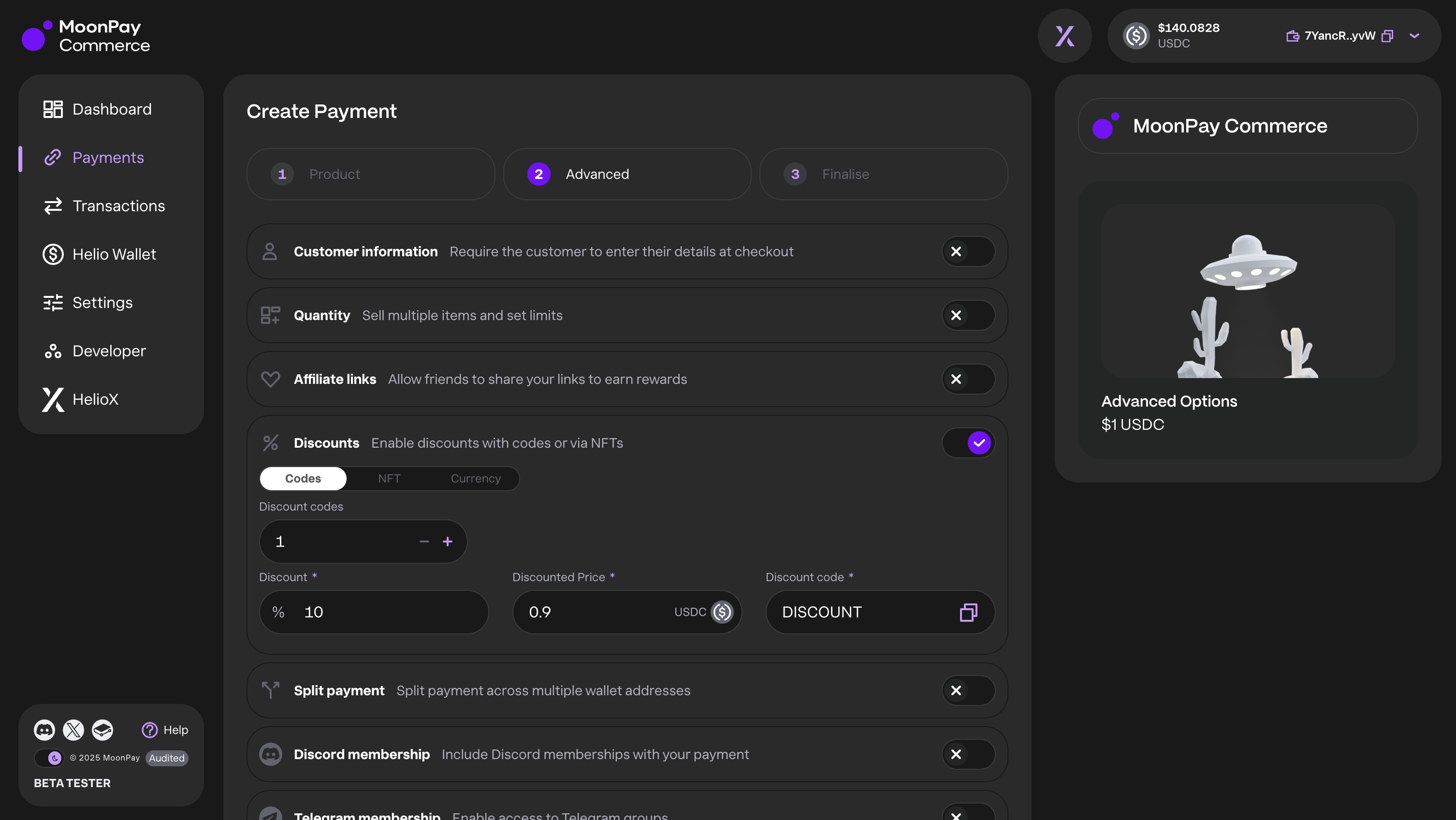 To set up discounts, go to MoonPay Commerce Dashboard → Create Payment → Advanced → Discounts to define up to 100 discount codes per Pay Link. Enter each discount level and code; users can apply the code at checkout.