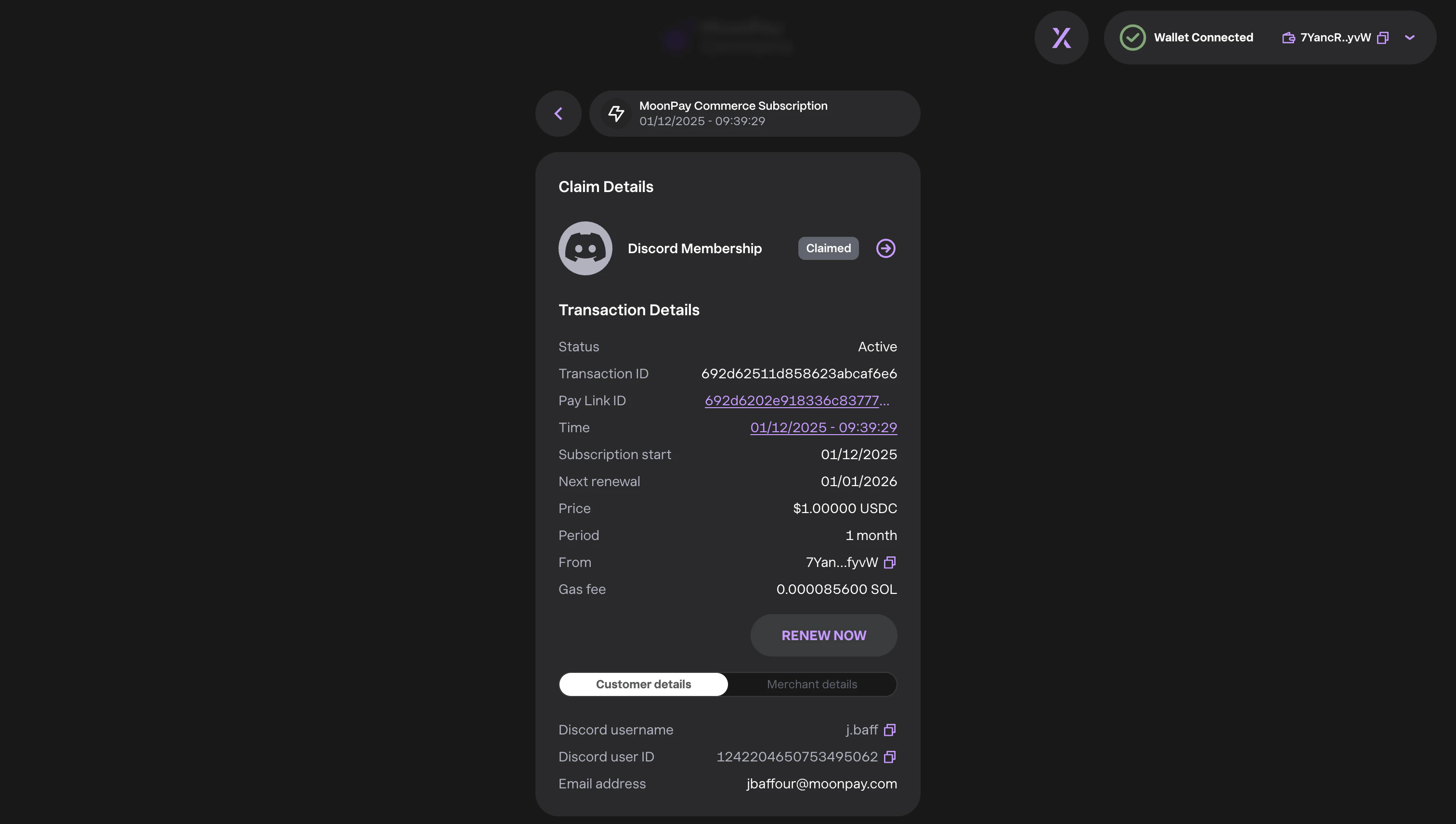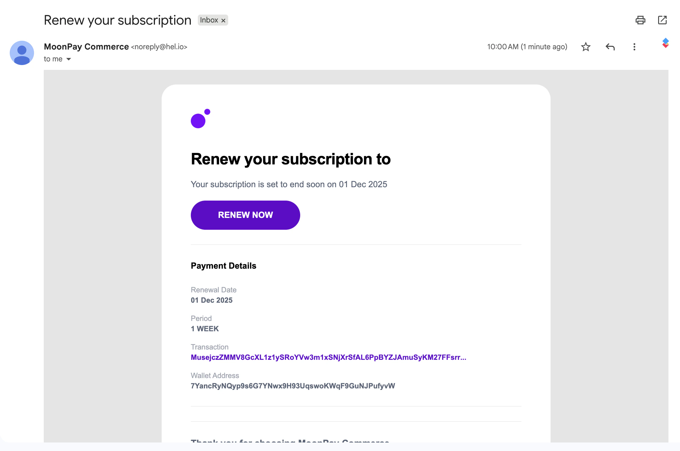 - Customers connect their wallet and provide their email during their first checkout. Use webhooks and the API to confirm and query subscriptions records (started, renewed, ended).